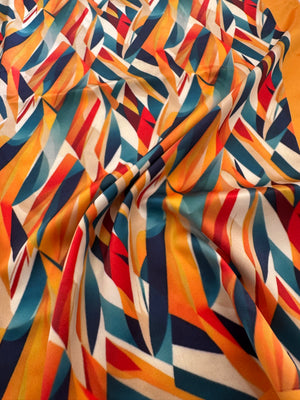 Tons vibrantes de vermelho, azul, laranja e branco.